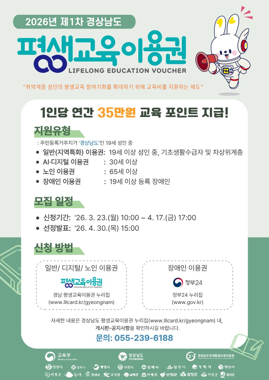 [아시아월드뉴스] 3월 23일부터 4월 17일까지 온라인 접수, 1인당 35만원 지원 함양군은 군민의 자기 계발과 교육 격차 완화를 위해 3월 23일부터 4월 17일까지 '2026년 경상남도 평생교육이용권'1차 신청을 받는다고 밝혔다.